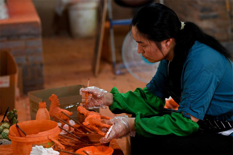 6月6日,工作人員在南石山村的唐三彩商鋪內(nèi)通過手機(jī)直播銷售唐三彩。河南省洛陽市朝陽鎮(zhèn)南石山村以生產(chǎn)唐三彩而聞名。近年來,當(dāng)?shù)卣e極引導(dǎo)三彩產(chǎn)業(yè)數(shù)字化建設(shè)工作,推動(dòng)唐三彩燒制技藝傳習(xí)館、唐三彩陶藝博物館、唐三彩文化研學(xué)所等優(yōu)化升級(jí)。目前,南石山村唐三彩產(chǎn)業(yè)的專業(yè)燒制藝人有2000余人、文化企業(yè)68家,年產(chǎn)值達(dá)3.5億元。