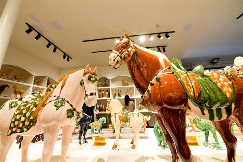 6月6日在南石山村拍攝的唐三彩作品陳列。河南省洛陽市朝陽鎮(zhèn)南石山村以生產(chǎn)唐三彩而聞名。近年來,當(dāng)?shù)卣e極引導(dǎo)三彩產(chǎn)業(yè)數(shù)字化建設(shè)工作,推動(dòng)唐三彩燒制技藝傳習(xí)館、唐三彩陶藝博物館、唐三彩文化研學(xué)所等優(yōu)化升級(jí)。目前,南石山村唐三彩產(chǎn)業(yè)的專業(yè)燒制藝人有2000余人、文化企業(yè)68家,年產(chǎn)值達(dá)3.5億元。