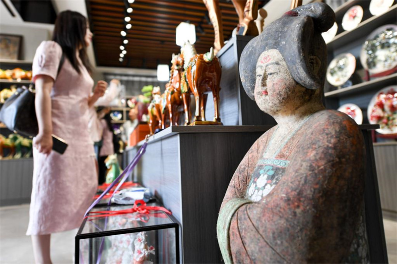 6月6日,游客在南石山村的唐三彩商鋪內(nèi)選購商品。河南省洛陽市朝陽鎮(zhèn)南石山村以生產(chǎn)唐三彩而聞名。近年來,當(dāng)?shù)卣e極引導(dǎo)三彩產(chǎn)業(yè)數(shù)字化建設(shè)工作,推動(dòng)唐三彩燒制技藝傳習(xí)館、唐三彩陶藝博物館、唐三彩文化研學(xué)所等優(yōu)化升級(jí)。目前,南石山村唐三彩產(chǎn)業(yè)的專業(yè)燒制藝人有2000余人、文化企業(yè)68家,年產(chǎn)值達(dá)3.5億元。