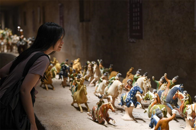 6月6日,游客在南石山村的唐三彩作品陳列展示館內(nèi)參觀。河南省洛陽市朝陽鎮(zhèn)南石山村以生產(chǎn)唐三彩而聞名。近年來,當(dāng)?shù)卣e極引導(dǎo)三彩產(chǎn)業(yè)數(shù)字化建設(shè)工作,推動(dòng)唐三彩燒制技藝傳習(xí)館、唐三彩陶藝博物館、唐三彩文化研學(xué)所等優(yōu)化升級(jí)。目前,南石山村唐三彩產(chǎn)業(yè)的專業(yè)燒制藝人有2000余人、文化企業(yè)68家,年產(chǎn)值達(dá)3.5億元。