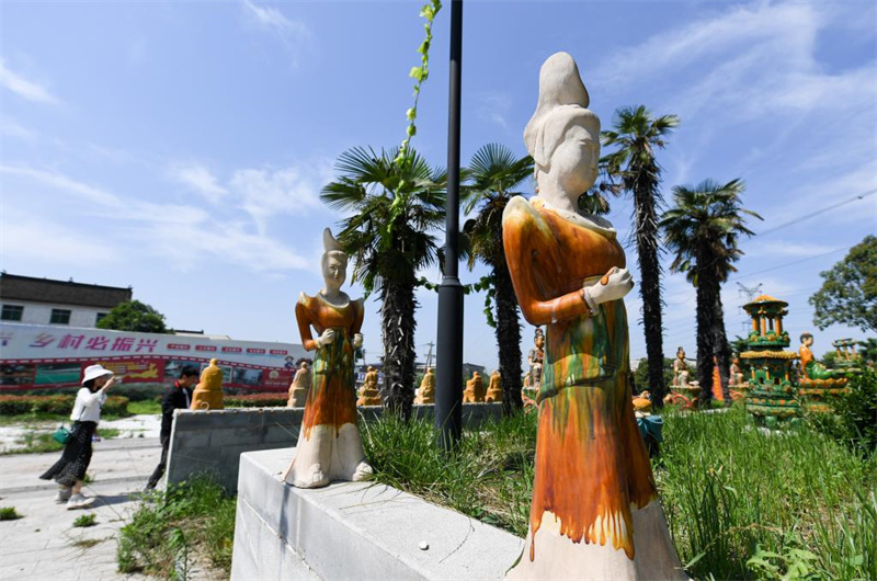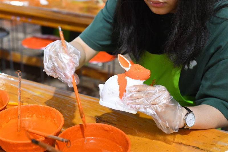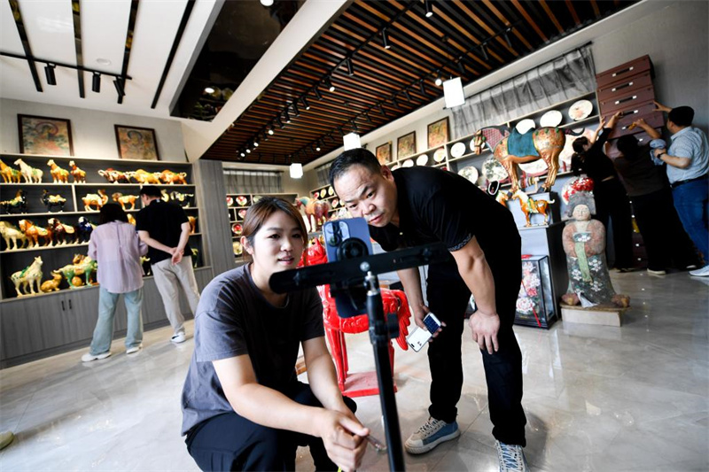 6月6日,游客在南石山村的唐三彩作品陳列展示館內(nèi)參觀。河南省洛陽市朝陽鎮(zhèn)南石山村以生產(chǎn)唐三彩而聞名。近年來,當(dāng)?shù)卣e極引導(dǎo)三彩產(chǎn)業(yè)數(shù)字化建設(shè)工作,推動(dòng)唐三彩燒制技藝傳習(xí)館、唐三彩陶藝博物館、唐三彩文化研學(xué)所等優(yōu)化升級(jí)。目前,南石山村唐三彩產(chǎn)業(yè)的專業(yè)燒制藝人有2000余人、文化企業(yè)68家,年產(chǎn)值達(dá)3.5億元。