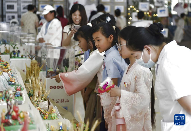 6月8日,學(xué)生們在活動現(xiàn)場參觀展出的非遺作品。當(dāng)日,一場主題為“創(chuàng)意非遺嘉年華”的非遺項(xiàng)目展示體驗(yàn)活動在河南省鄭州經(jīng)濟(jì)技術(shù)開發(fā)區(qū)列子小學(xué)舉行。作為河南省非物質(zhì)文化遺產(chǎn)社會傳承基地,列子小學(xué)在活動現(xiàn)場設(shè)置非遺工坊體驗(yàn)、非遺節(jié)目展演等內(nèi)容,讓參與活動的嘉賓和學(xué)生沉浸式感受傳統(tǒng)文化魅力,推動非物質(zhì)文化遺產(chǎn)的傳承與發(fā)展。