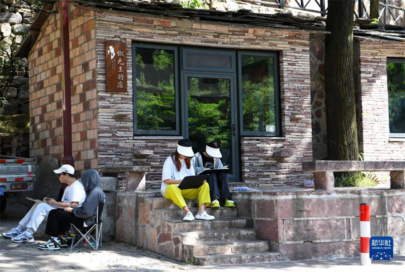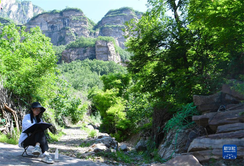 這是6月9日拍攝的河南安陽林州市石板巖鎮(zhèn)三畝地村(無人機(jī)照片)。望太行絕壁,畫小橋流水,位于太行山深處的河南安陽林州市石板巖鎮(zhèn),自然風(fēng)光秀美,深受繪畫愛好者的青睞。近年來,當(dāng)?shù)夭粩嗤诰虼迓湮幕瘍?nèi)涵,發(fā)展寫生經(jīng)濟(jì),吸引書畫美術(shù)院校和機(jī)構(gòu)在此設(shè)立寫生基地,目前全鎮(zhèn)擁有各類民宿400余家,年接待寫生人群200余萬人次。