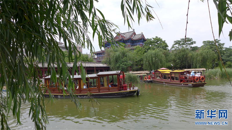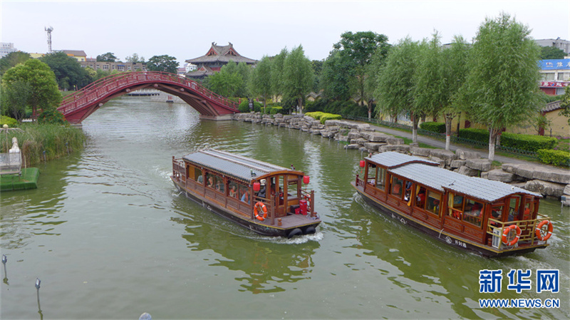 6月11日,河南省開封市大宋御河,人們乘坐“水上巴士”進(jìn)行游覽觀光。