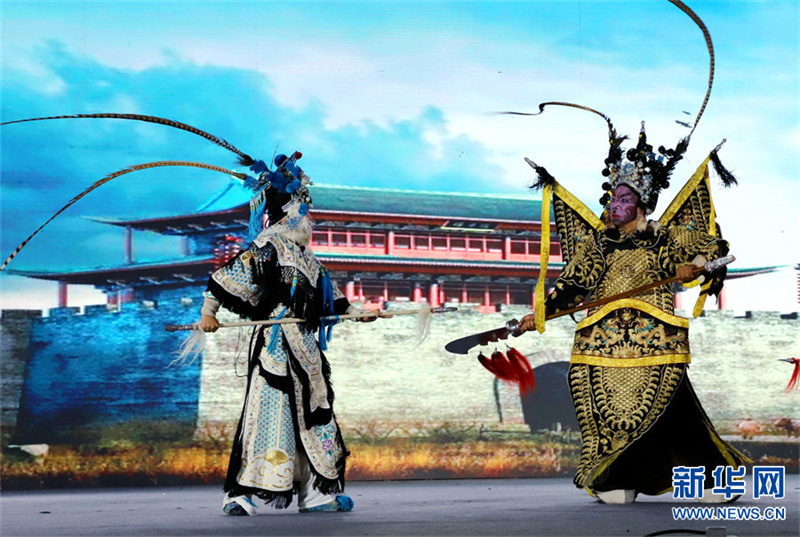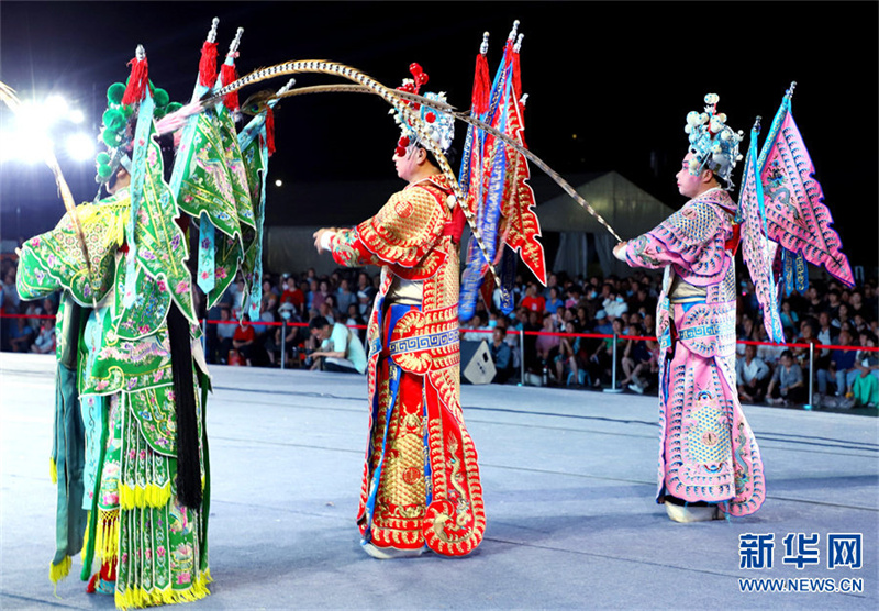 6月12日晚,河南省南陽市解放廣場,南陽市內(nèi)鄉(xiāng)宛梆劇團的演員在表演傳統(tǒng)劇目《樊梨花征西》。宛梆是流行于河南省南陽市的地方劇種,已有近400年的歷史。2006年,宛梆入選國家級非物質(zhì)文化遺產(chǎn)代表性項目名錄。多年來,河南省南陽市各宛梆劇團的演員扎根基層,每年演出800多場,讓百姓在家門口感受非遺戲曲的藝術(shù)魅力。
