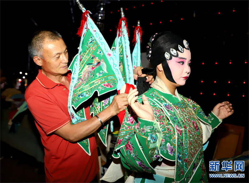 6月12日晚,河南省南陽市解放廣場,南陽市內(nèi)鄉(xiāng)宛梆劇團的工作人員在后臺幫助演員穿“大靠”。