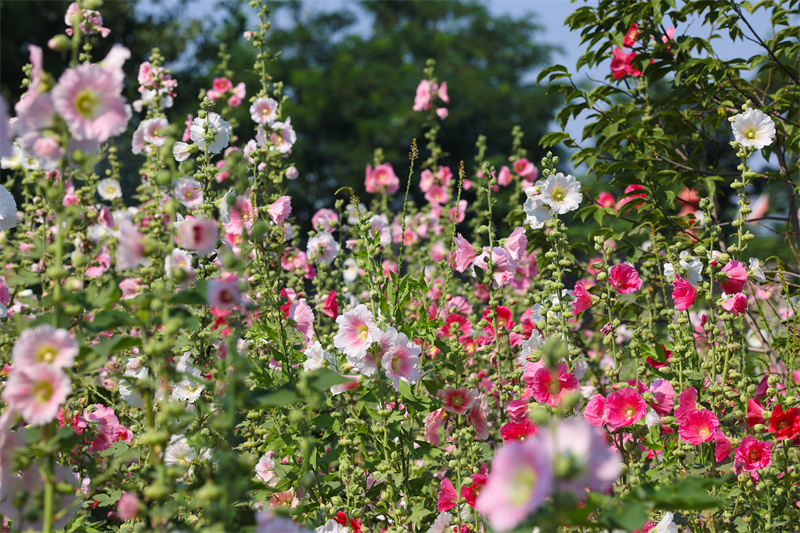 6月14日,在開封城墻公園里,一大片蜀葵映入記者眼簾,紅的、白的、粉的,各色花兒盛開,美不勝收。
