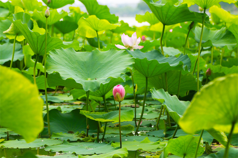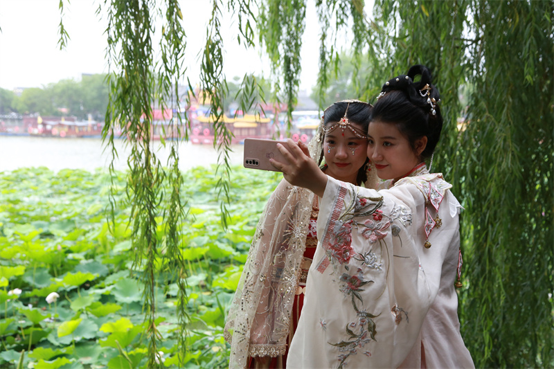 在開(kāi)封一景區(qū),荷花盛開(kāi),荷香隨風(fēng)四溢,吸引游客打卡拍照。