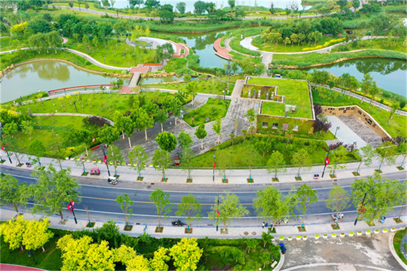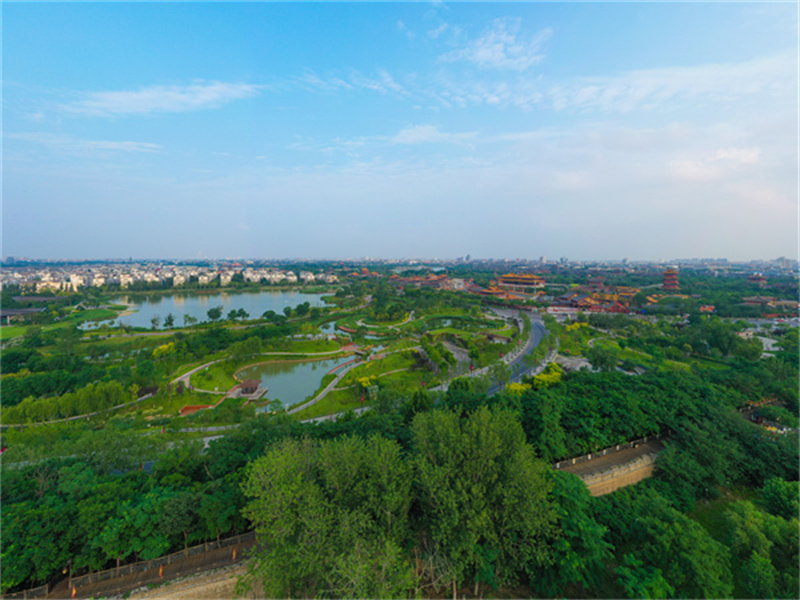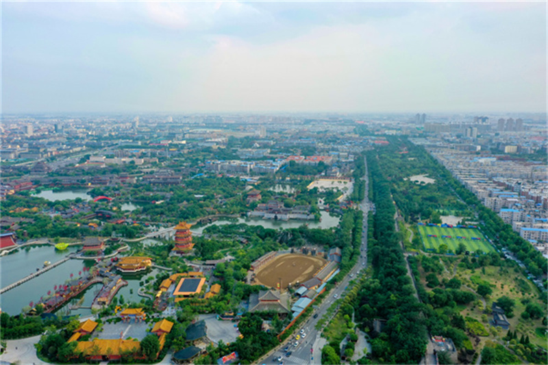 6月19日,雨后開封古城天氣放晴,街道、公園綠意滿滿,美景如畫。
