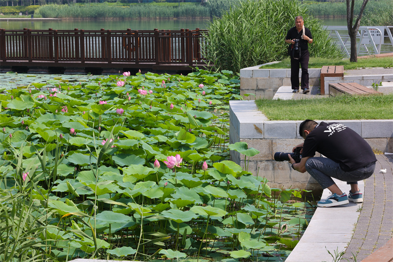 6月20日,西北湖濕地公園荷花競相綻放,吸引市民、游客前來拍照打卡。