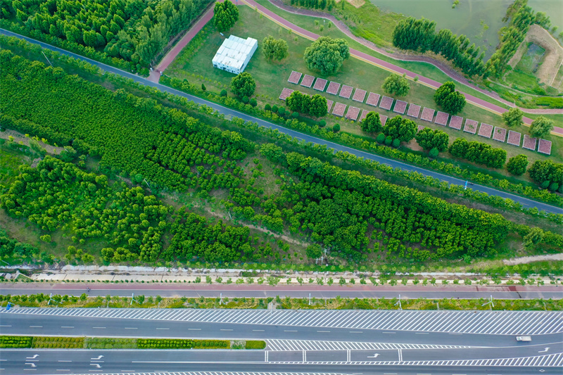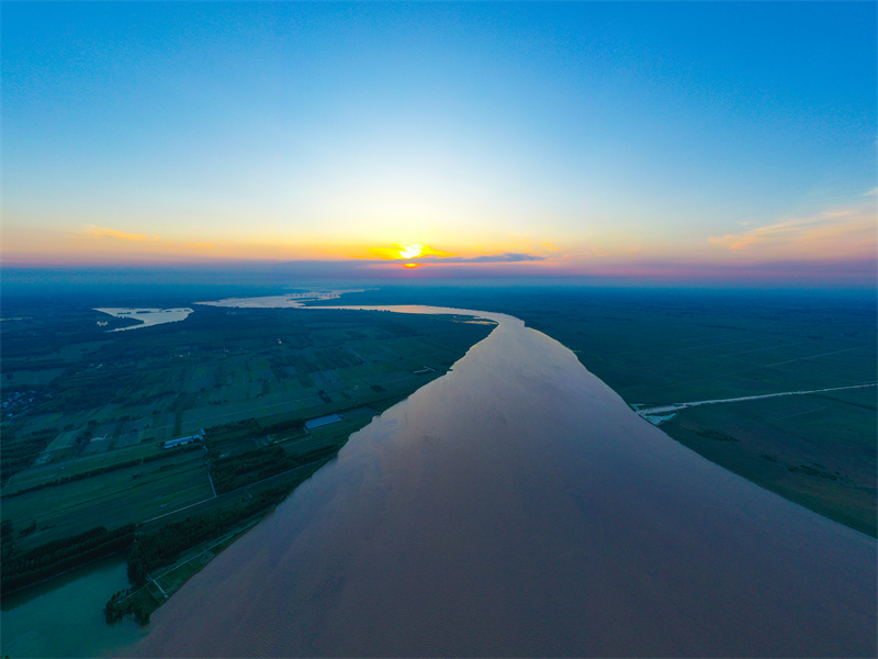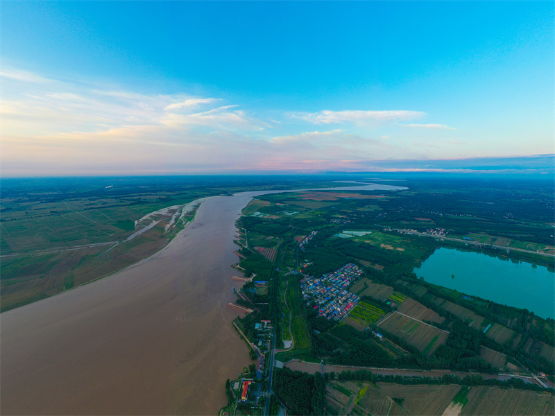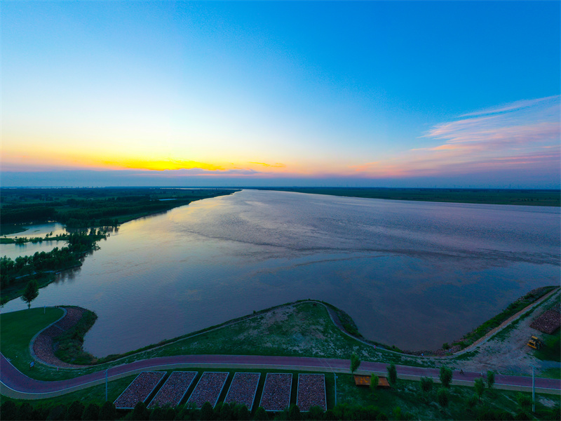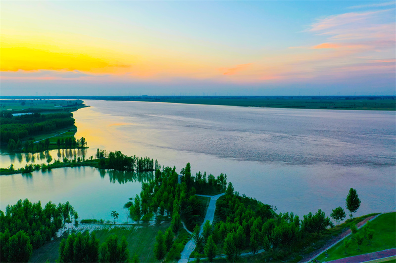 數(shù)十公里長(zhǎng)的綠色長(zhǎng)廊沿黃河開封段曲折蜿蜒,黃河生態(tài)廊道散發(fā)出無(wú)窮的魅力。夕陽(yáng)下,生態(tài)綠廊與岸邊農(nóng)田構(gòu)成一幅美麗的綠色生態(tài)畫卷。開封+記者石斐6月26日攝