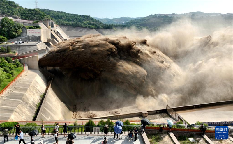 這是7月7日拍攝的黃河小浪底水庫排沙出庫場景(無人機照片)。當(dāng)日,黃河小浪底水庫排沙出庫,裹挾著大量泥沙的水流從排沙洞奔騰而出,十分壯觀,吸引眾多游客前來觀賞。新華社發(fā)(苗秋鬧攝)