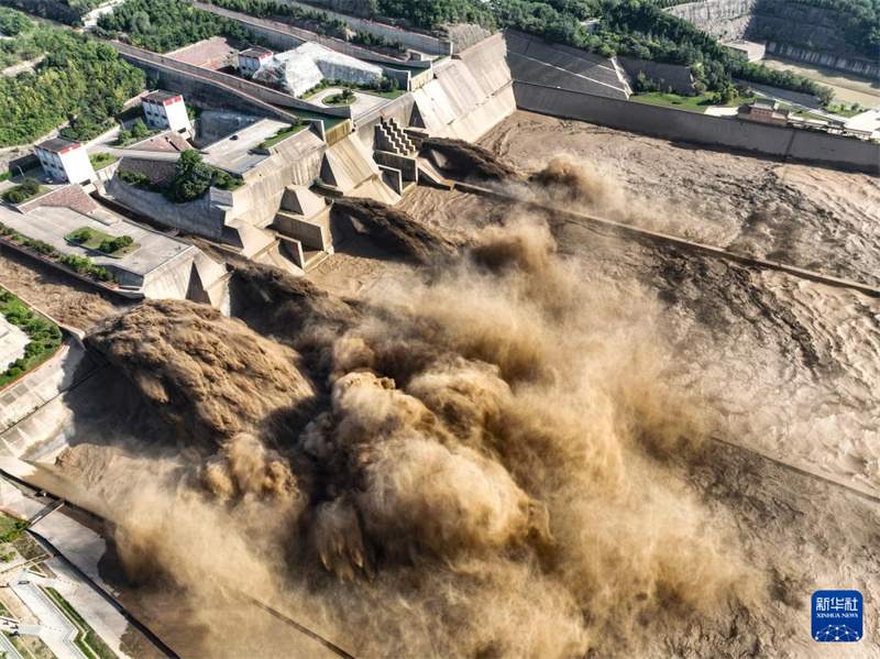 這是7月7日拍攝的黃河小浪底水庫排沙出庫場景(無人機照片)。新華社發(fā)(段二平攝)
