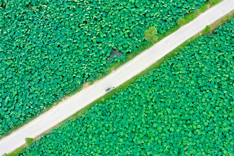 7月11日,開封市民在順河回族區(qū)土柏崗街道盤石村荷塘旁拍照。眼下,盤石村千畝荷塘一片碧綠之中鑲嵌著朵朵或白或紅的花兒,微風(fēng)吹起,荷香四溢,吸引不少市民到此休閑賞荷。 開封+記者 石斐 攝