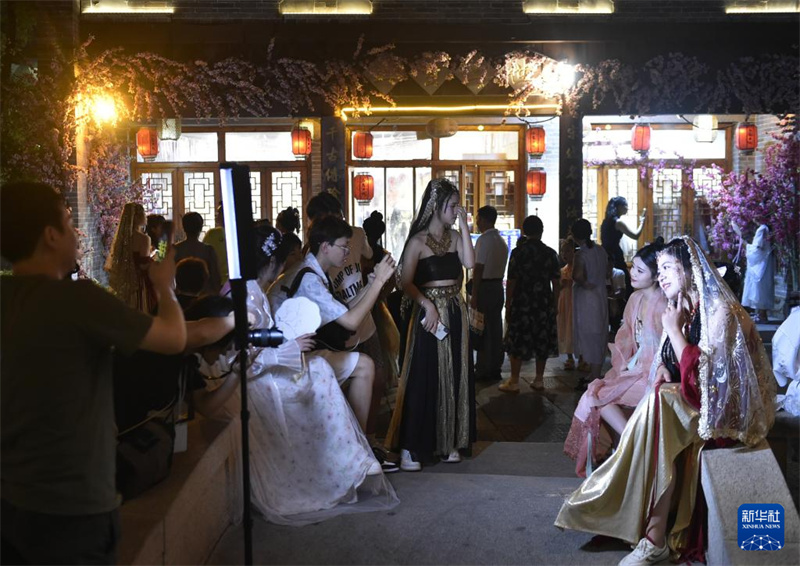 7月11日晚,游人身穿古裝在洛陽(yáng)市洛邑古城景區(qū)內(nèi)拍照。新華社記者 魯鵬 攝