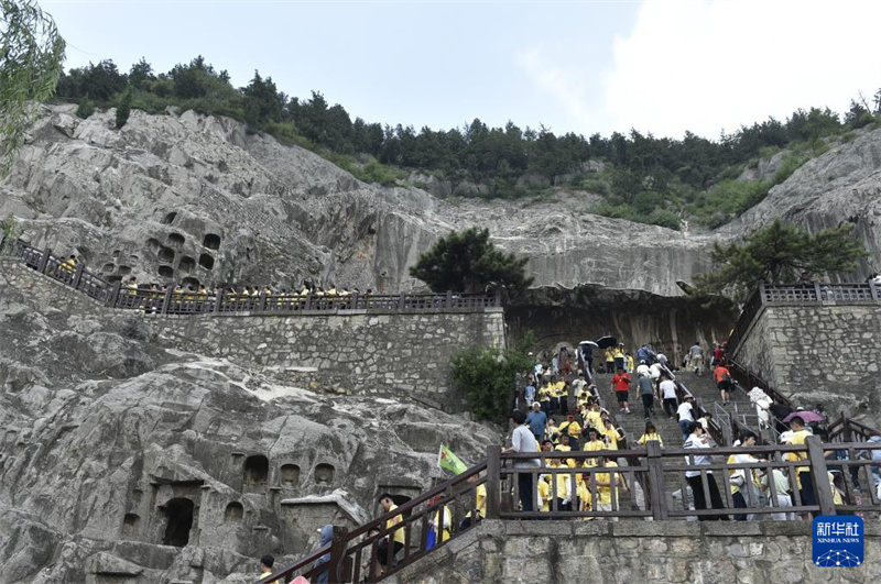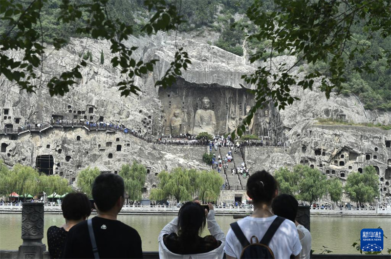 7月11日,游人在洛陽市龍門石窟景區(qū)游覽。進(jìn)入暑期,河南省洛陽市的各大名勝古跡迎來眾多游人。具有5000多年文明史、4000多年建城史和1500多年建都史的古都洛陽以其深厚的歷史底蘊(yùn)和豐富的文旅資源吸引著八方游客。新華社記者 魯鵬 攝