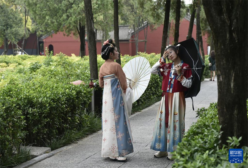 7月11日,身穿古裝的游人在洛陽市白馬寺景區(qū)游覽。新華社記者 魯鵬 攝