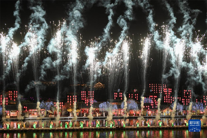 7月14日,演員在開封清明上河園景區(qū)內(nèi)演繹大型水上實(shí)景演出《大宋·東京夢(mèng)華》。新華社記者 吳剛 攝