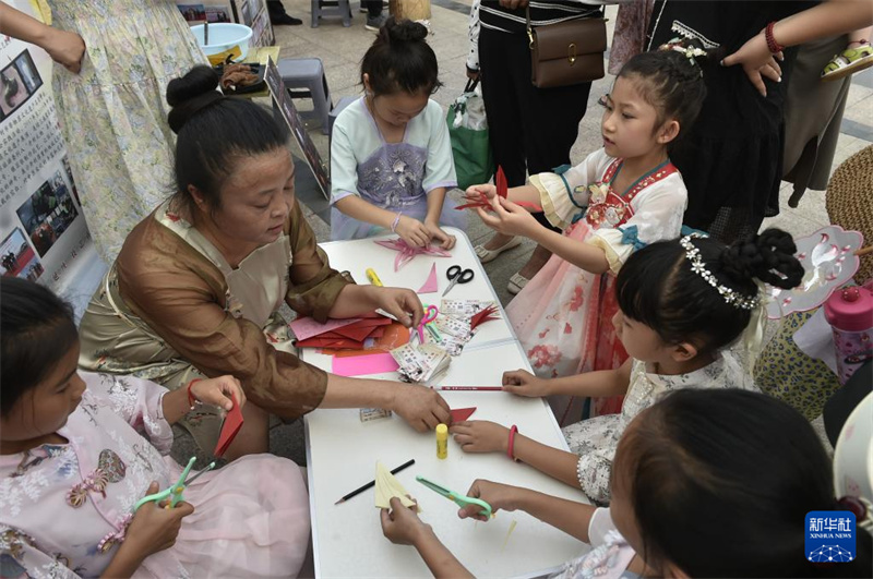 7月14日傍晚,小朋友在開封市開元廣場設(shè)立的“非遺市集”現(xiàn)場體驗剪紙技藝。新華社記者 魯鵬 攝