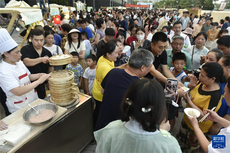 7月14日傍晚,游人在開封市開元廣場設(shè)立的“非遺市集”現(xiàn)場品嘗開封灌湯包。新華社記者 魯鵬 攝