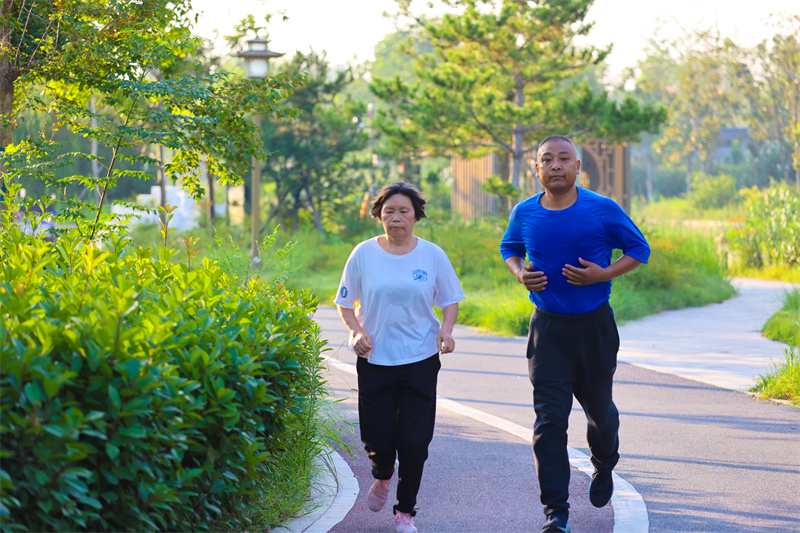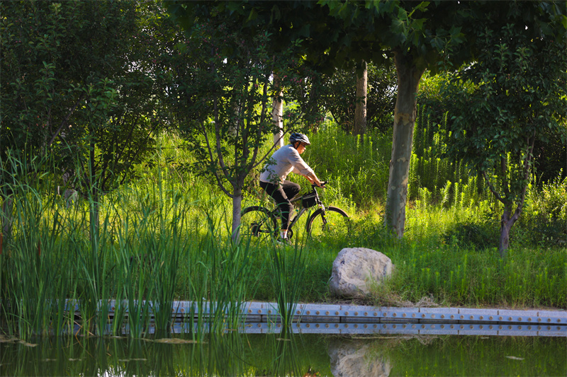 7月17日清晨,朝陽中,開封澗水河岸邊花草繁盛、環(huán)境迷人,吸引不少市民前來健身休閑。開封 記者 石斐 攝