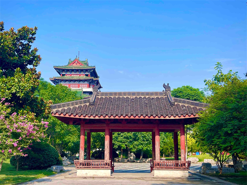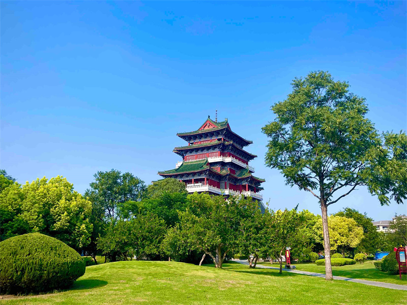 7月18日,開封寶津樓花園一派綠意盎然的景象。開封+記者 姜菡 攝