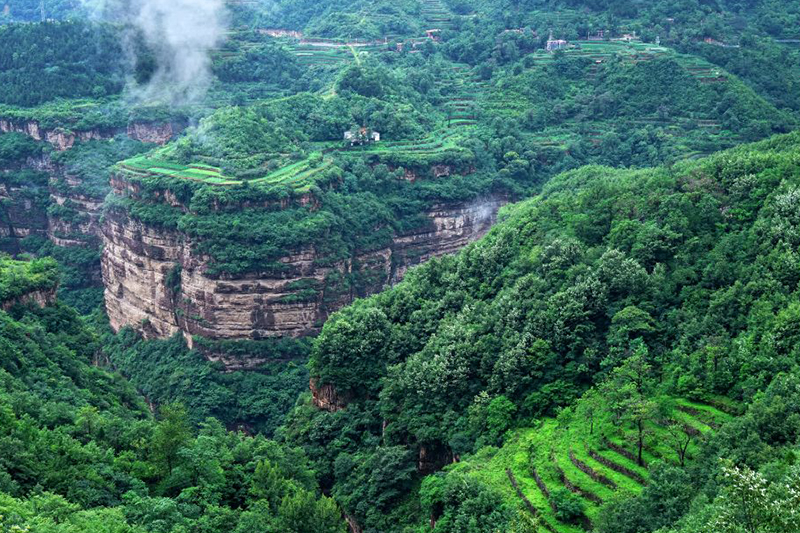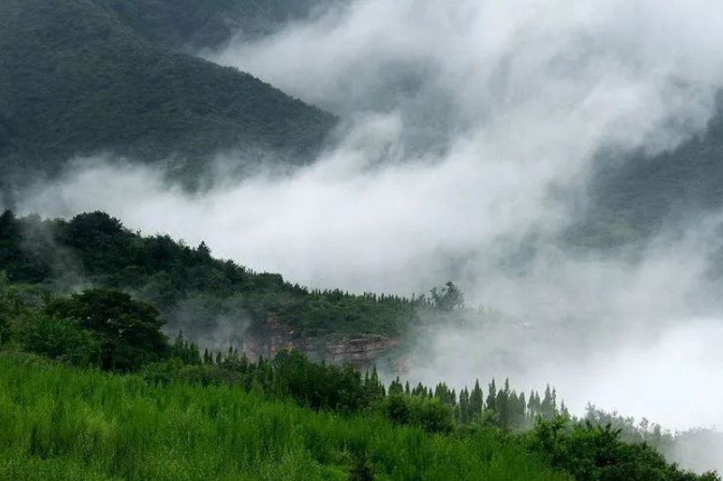 夏天多雨,在太行大峽谷時有云海出沒。每每雨后,薄霧升騰,在森林上空相遇,云霧纏繞,形成一團(tuán)團(tuán),一片片的云霧,甚至云海。山峰時隱時現(xiàn),如大海中飄蕩的小舟,薄霧繚繞時,如輕紗、縷煙,悠悠往來,或呈現(xiàn)云海波濤滾涌,隱現(xiàn)蕩漾。