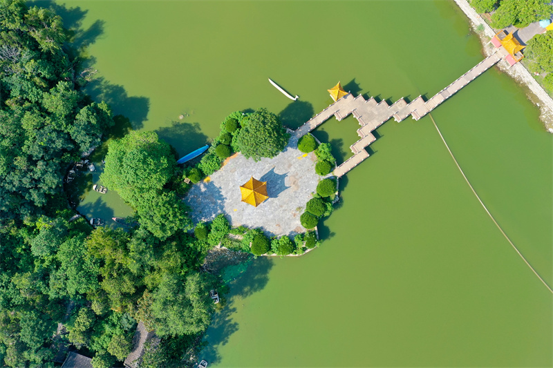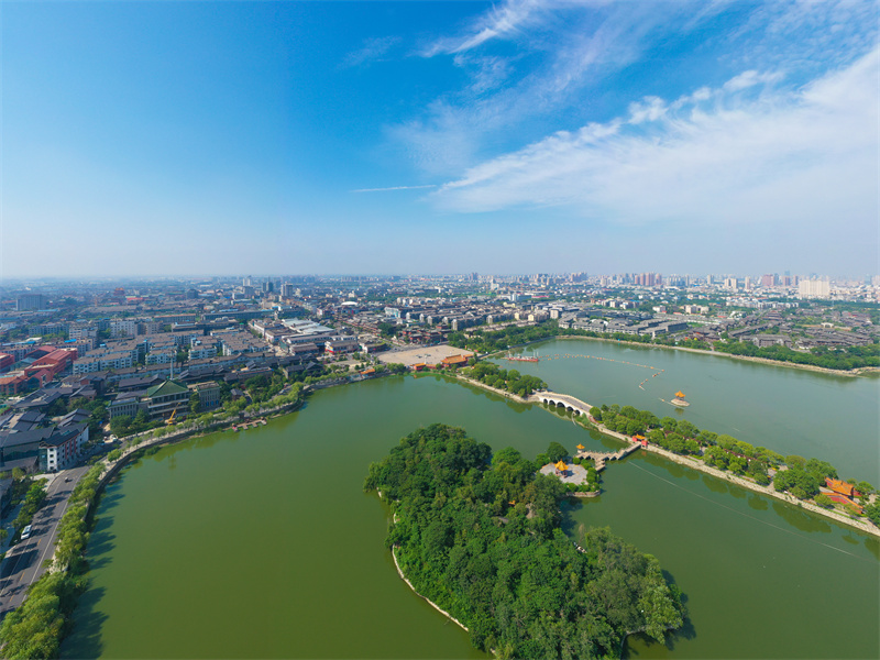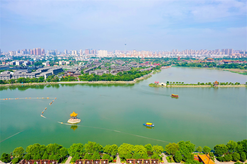 8月7日,古城開封碧水藍(lán)天,一派郁郁蔥蔥的景象,游客們熱情高漲,泛舟湖上,穿行其中,領(lǐng)略古城魅力。開封+記者 石斐 攝
