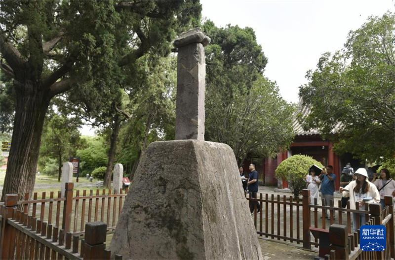 8月7日,參加集體采訪活動的媒體記者參觀河南登封“天地之中”歷史建筑群中的周公測景臺。新華社記者 魯鵬 攝