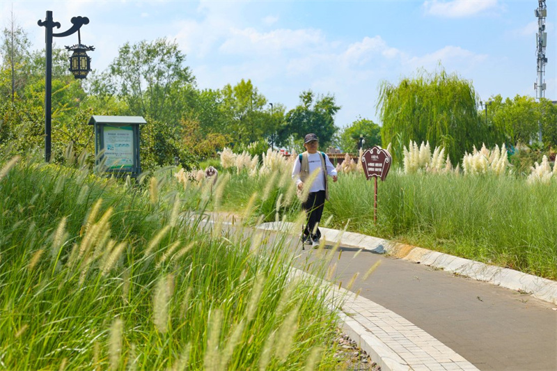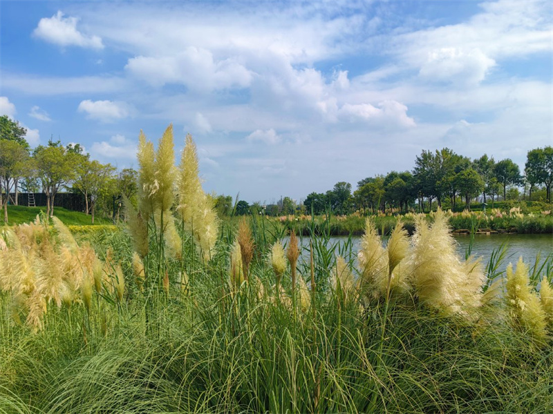 西北湖濕地公園層層疊疊的蘆葦隨風(fēng)搖曳,與藍(lán)天白云共同構(gòu)成一幅美麗的畫卷。 開封+記者石斐8月28日攝