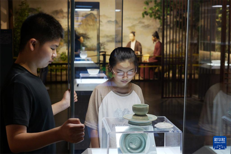 8月30日,游人在寶豐汝窯博物館參觀。河南省寶豐縣是汝瓷文化之鄉(xiāng),2011年汝瓷燒制技藝被列入國家級非物質(zhì)文化遺產(chǎn)名錄。全國重點(diǎn)文物保護(hù)單位清涼寺汝官窯遺址位于河南省寶豐縣大營鎮(zhèn)清涼寺村,汝官窯遺址展示館和汝窯博物館于2017年相繼在當(dāng)?shù)亟ǔ砷_放,為游客了解和感受汝瓷文化提供了重要平臺和展示窗口。新華社記者 魯鵬 攝