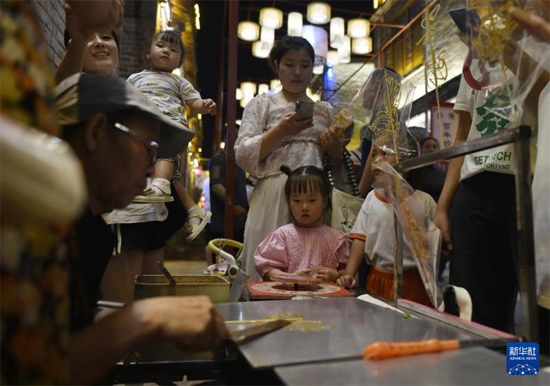 9月7日晚,游人在安陽古城縣前街“古韻鎏光·燈火安陽”沉浸式夜游活動現(xiàn)場選購糖畫。新華社記者 魯鵬 攝