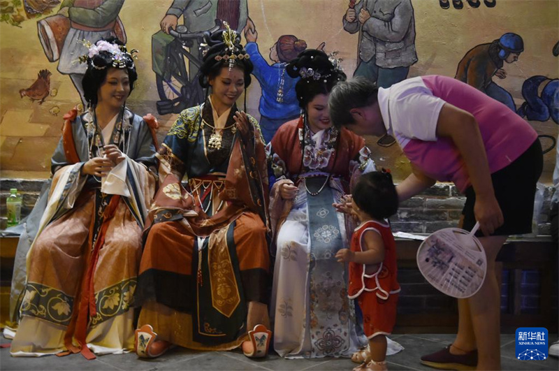 9月7日晚,身穿古裝的游人在安陽古城縣前街的夜游活動現(xiàn)場與小朋友互動。新華社記者 魯鵬 攝