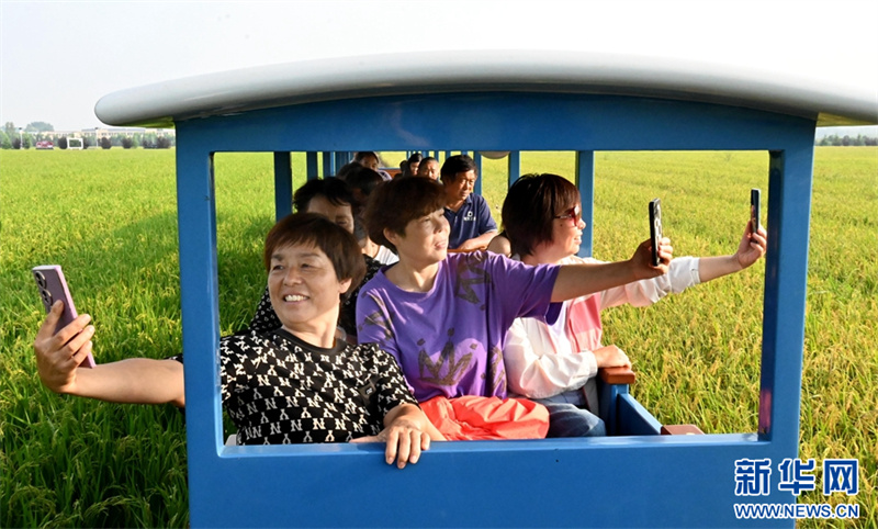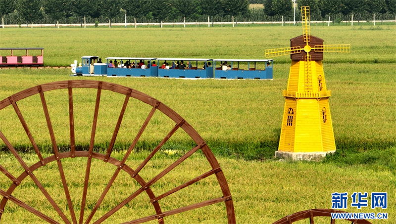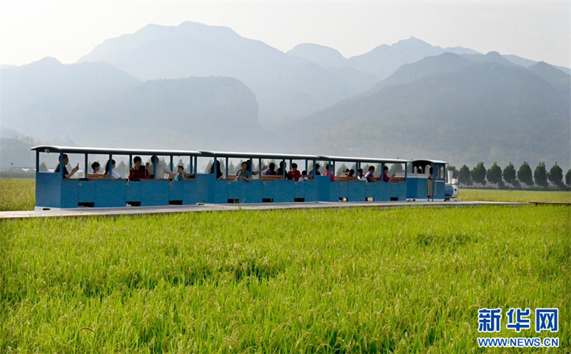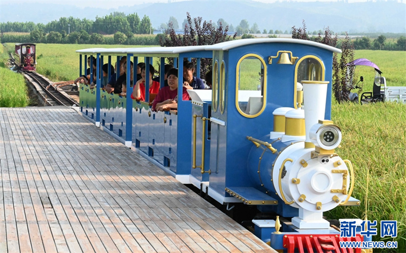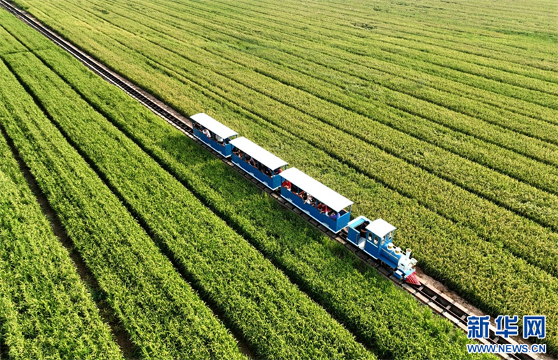 9月9日,河南省汝陽縣三屯鎮(zhèn)東保村,游客乘坐小火車在觀賞千畝稻田的美麗景色。近年來,河南省汝陽縣三屯鎮(zhèn)東保村因地制宜地發(fā)展特色農(nóng)業(yè)種植,走農(nóng)旅融合發(fā)展之路,借助山水田園風(fēng)光,打造農(nóng)文旅融合發(fā)展綜合體,推動農(nóng)業(yè)增效、農(nóng)民增收。新華網(wǎng)發(fā)(高山岳 李景堂 攝)