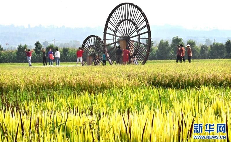 9月9日,河南省汝陽縣三屯鎮(zhèn)東保村,游客在稻田里游玩。