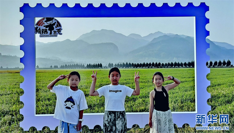 9月9日,河南省汝陽縣三屯鎮(zhèn)東保村,小朋友在稻田打卡點拍照。