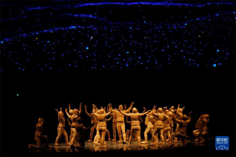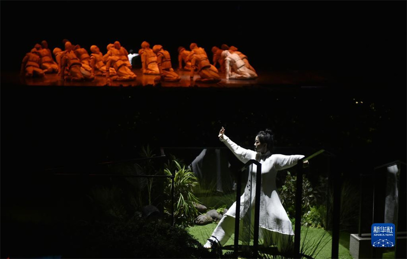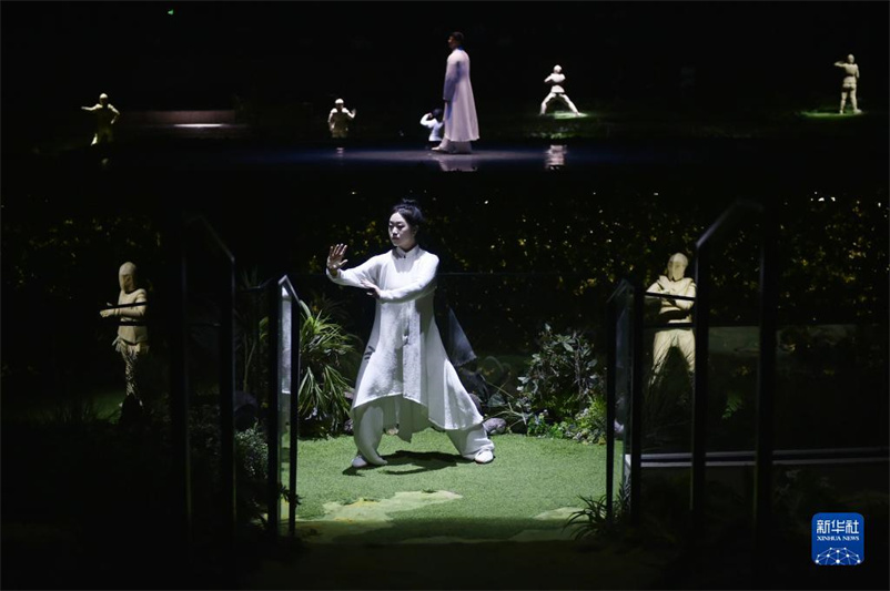 這是9月14日拍攝的《印象·太極》演出現(xiàn)場。河南省焦作市溫縣陳家溝是太極拳的發(fā)源地。位于陳家溝的太極全域劇場采用實景與多媒體相結(jié)合的方式,圍繞360度旋轉(zhuǎn)舞臺,打造沉浸式體驗演出《印象·太極》,讓觀眾在動靜之間感受太極文化。新華社記者 戴翹楚 攝