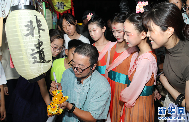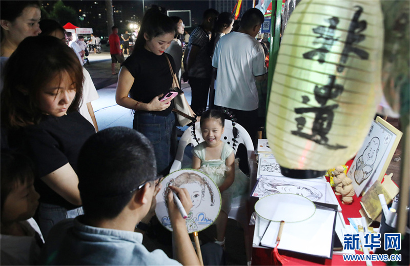 9月16日晚,尉氏縣人民廣場(chǎng),一非遺傳承人在為孩子作畫。