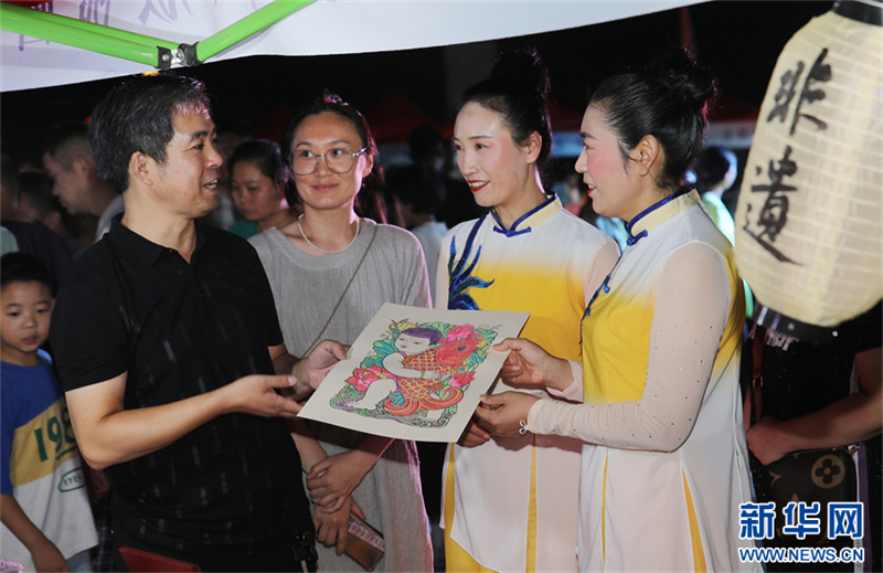 9月16日晚,尉氏縣人民廣場(chǎng),尉氏縣木版年畫非遺傳承人在為游客展示產(chǎn)品。