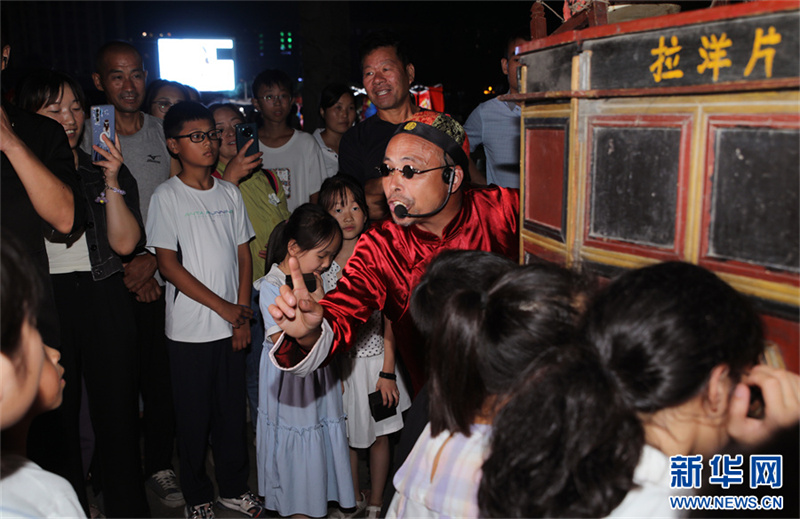 9月16日晚,尉氏縣人民廣場(chǎng),游客在觀看“拉洋片”。