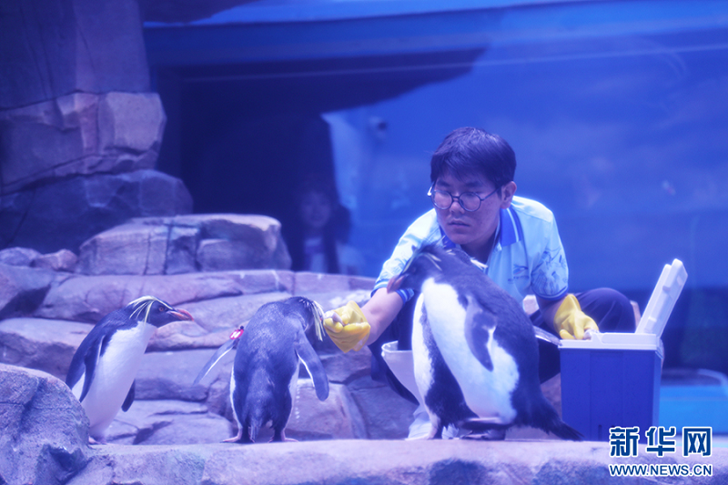 9月28日,鄭州海昌海洋旅游度假區(qū),工作人員正在給小企鵝喂食。