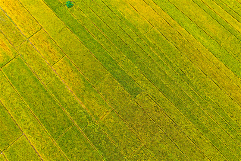 10月7日,順河回族區(qū)東郊鄉(xiāng)道士房村稻穗飄香,美如畫卷,從空中俯瞰,田野阡陌縱橫,一派豐收景象。開封+記者 石斐 攝