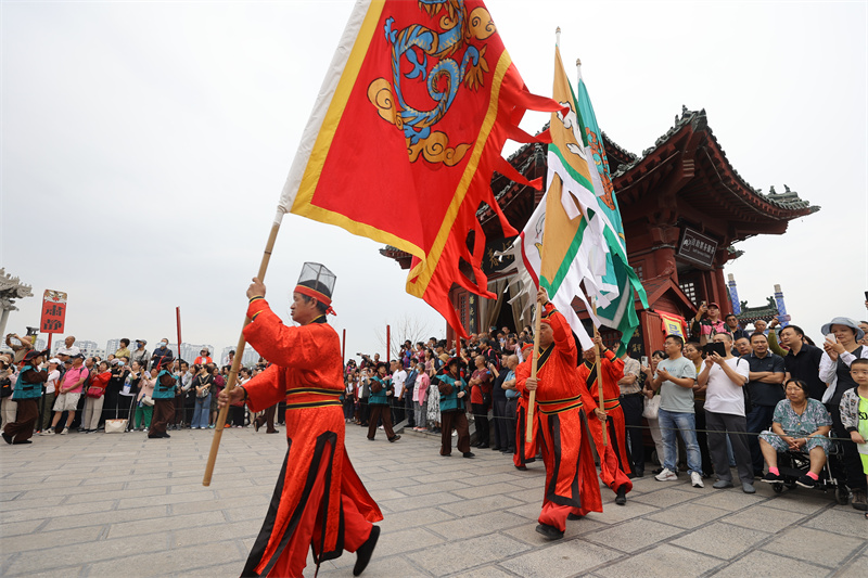 10月7日,游客在開封府景區(qū)門前觀看開衙迎賓演出。雖然中秋國慶假期結束,但仍有眾多游客慕名來到我市感受古城深厚的文化底蘊。 開封+記者 袁洋 攝