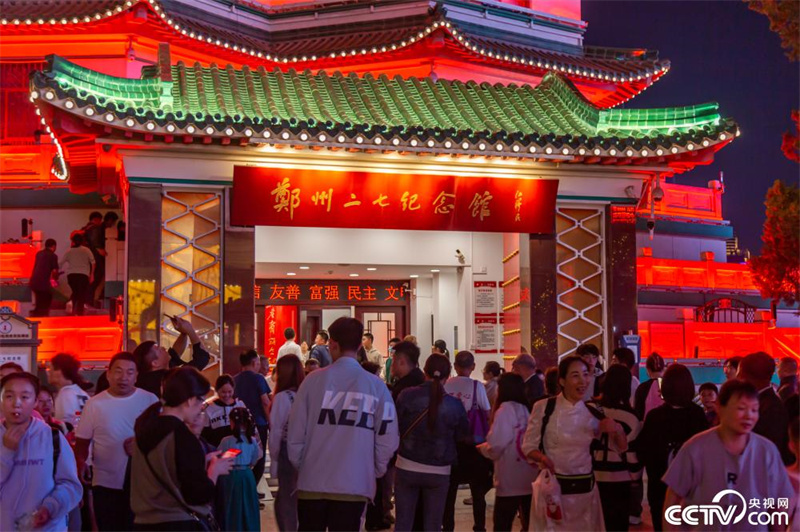 國(guó)慶期間,鄭州二七紀(jì)念塔廣場(chǎng)燈火璀璨,吸引大批游客前來(lái)游覽。今年國(guó)慶之夜,熱鬧非凡的鄭州二七廣場(chǎng)燈火璀璨,不少市民和游客帶著孩子走進(jìn)廣場(chǎng)內(nèi)的鄭州二七紀(jì)念塔,重溫紅色發(fā)展歷程,汲取奮進(jìn)力量。這是鄭州二七紀(jì)念塔建成52年來(lái)首次面向公眾進(jìn)行夜間開放。 視覺中國(guó)