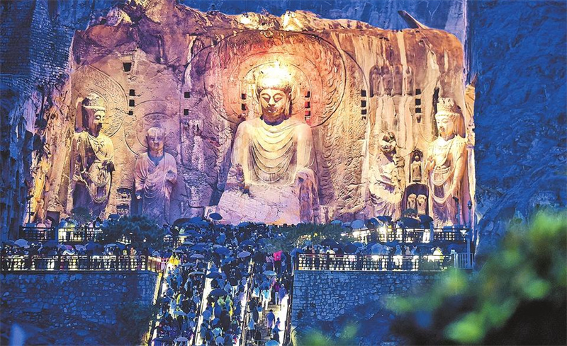 10月2日,洛陽龍門石窟景區(qū)開放“夜游”模式。夜幕下,景區(qū)內的佛龕造像在燈光映襯下,更顯如夢似幻的美妙意境,吸引眾多游客領略別樣的石窟歷史文化遺產魅力。黃政偉 攝