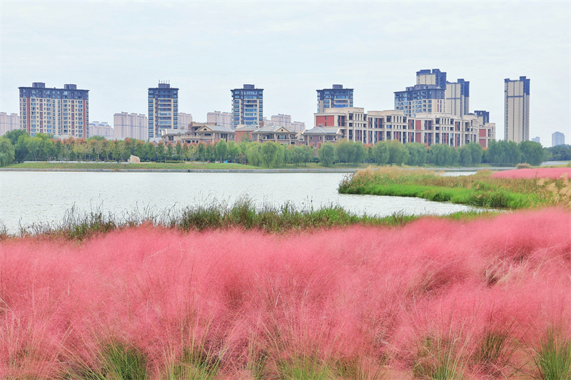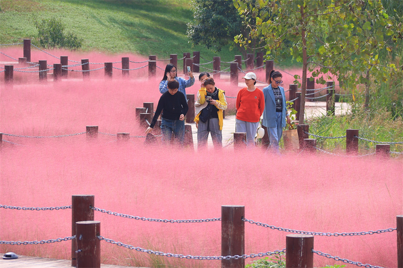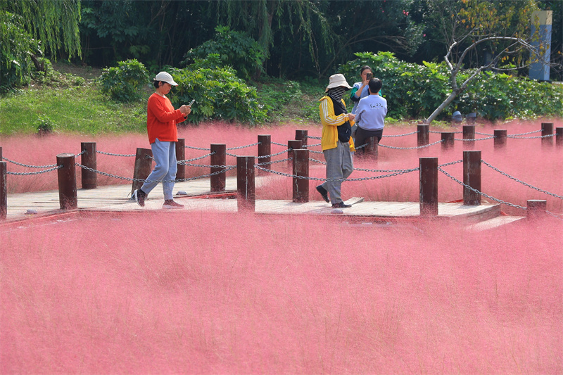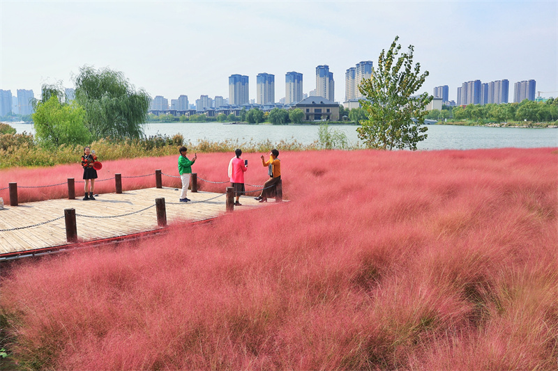 近日,粉黛亂子草進(jìn)入花期,黑崗口調(diào)蓄水庫旁的紅色“花!蔽S多市民前來游玩觀賞。開封+記者李浩 10月8日攝