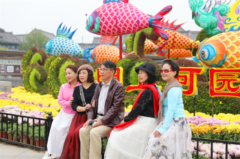 10月12日,游客在開封市景區(qū)游玩、賞菊,感受古城的魅力。開封+記者 姜菡 攝