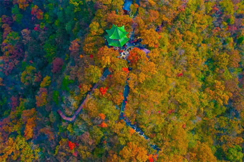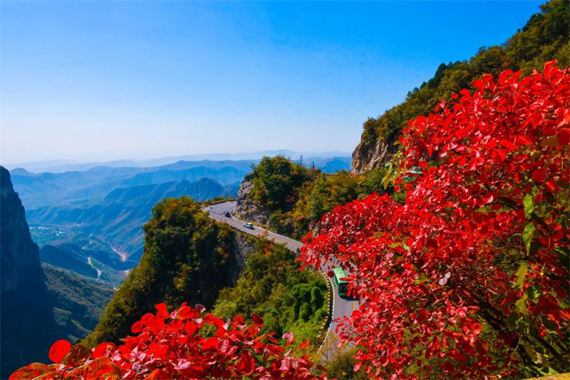 云臺山彩林紅葉漸入觀賞期,漫山紅葉次第綻放,成團(tuán)成簇點(diǎn)綴山間,行走其中猶如置身五彩畫卷。