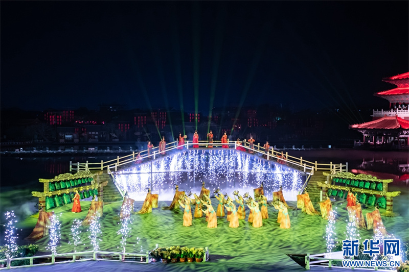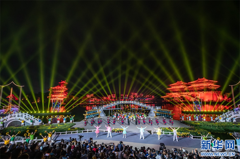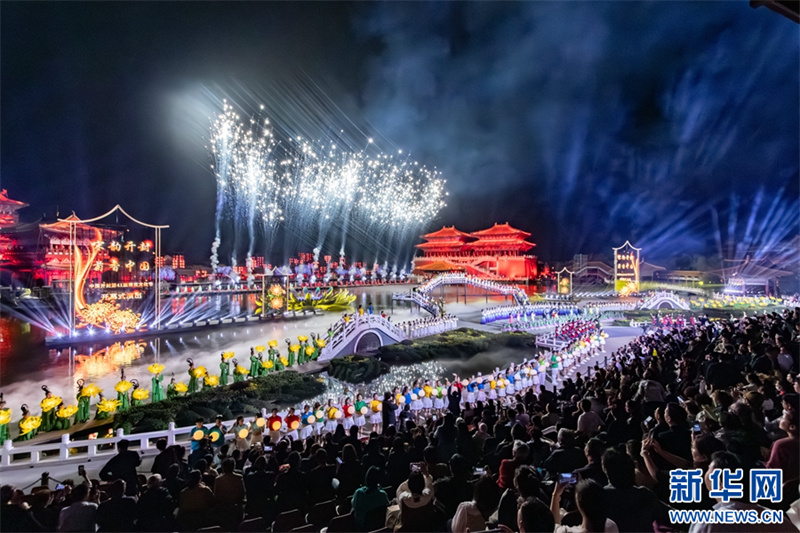 圖為中國開封第41屆菊花文化節(jié)開幕式文藝演出現(xiàn)場。10月17日晚,中國開封第41屆菊花文化節(jié)開幕式在開封清明上河園舉行。當(dāng)晚舉行的開幕式文藝演出活動以跨越開封千年時空為主線,由上篇《千年的汴京》、下篇《時代的開封》兩大部分共6個節(jié)目組成,并通過不同情境轉(zhuǎn)換的形式進行舞臺呈現(xiàn)。