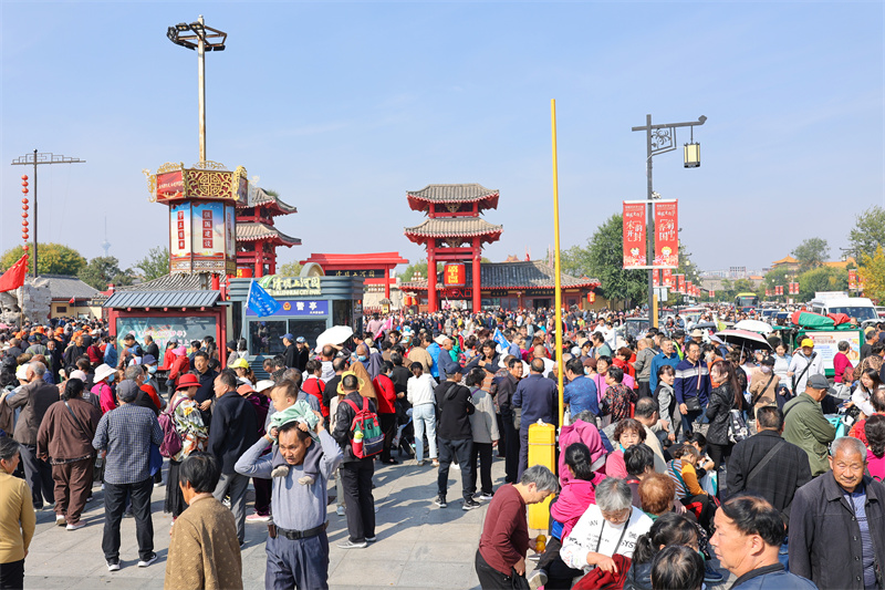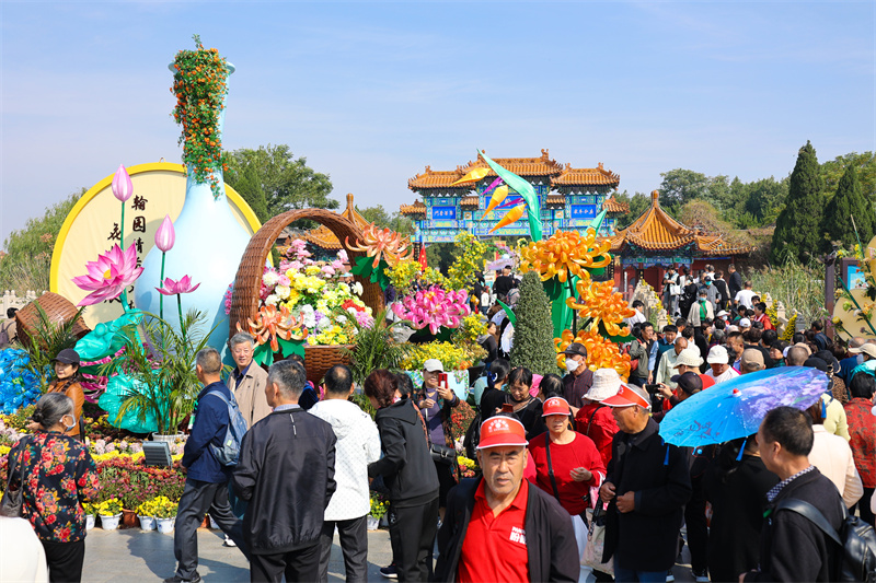 10月23日重陽(yáng)節(jié),宋都皇城旅游度假區(qū)內(nèi)人山人海,游客游城賞菊,十分熱鬧。開封+記者 石斐 攝